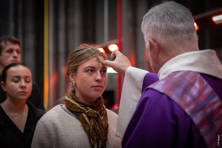 Một phụ nữ trẻ nhận tro đánh dấu Thứ Tư Lễ Tro bên trong Nhà thờ Đức Bà de la Treille - Nhà thờ chính tòa ở Lille, Pháp vào ngày 5 tháng 3 năm 2025. (ảnh: Brigitte Naeye / Brigitte Naeye)