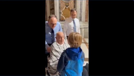 Đi cùng với y tá riêng của mình, Massimiliano Strappetti và một số nhân viên y tế, ngài đeo ống oxy thông mũi và vẫy tay chào du khách và ban phước cho một số trẻ em trong lần xuất hiện ngắn ngủi này.
