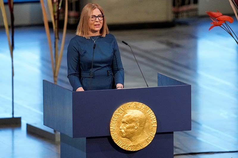 Natalia Pinchuk, đại diện cho chồng bà, nhà hoạt động Ales Bialiatski đến từ Belarus, có bài phát biểu về Giải Nobel Hòa bình trong lễ trao Giải Nobel Hòa bình năm 2022 tại Tòa thị chính Oslo ở Oslo, Na Uy, ngày 10 tháng 12 năm 2022. (OSV News/Rodrigo Fre