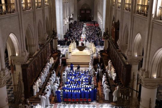 Dàn hợp xướng, giáo sĩ và khách mời trong buổi lễ mở cửa trở lại Nhà thờ Đức Bà Paris vào ngày 7 tháng 12 năm 2024, tại Paris. Nguồn: Pascal Le Segretain/Getty Images cho Notre-Dame de Paris