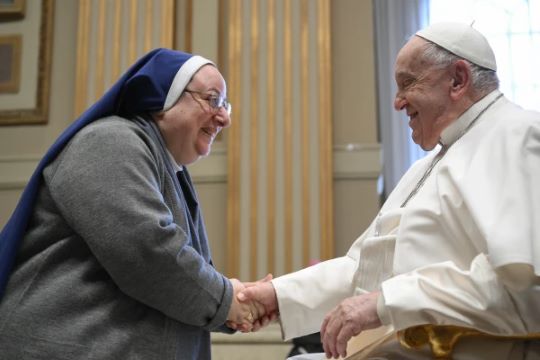 Đức Giáo Hoàng Phanxicô chào đón một người tham dự Đại hội Thần học Quốc tế, ngày 9 tháng 12 năm 2024. Tín dụng: Vatican Media