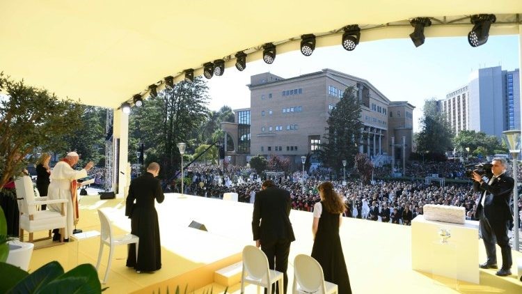 Các bạn thân mến, tôi rất vui khi thấy các bạn là một cộng đồng học thuật sống động, cởi mở với thực tại hiện thời, nơi Tin Mừng không chỉ là vật trang trí mà còn là nguồn cảm hứng cho những nỗ lực cá nhân và tập thể của các bạn. Tôi biết rằng cuộc sống của các bạn rất bận rộn, giữa học tập, bạn bè, phục vụ cộng đồng, trách nhiệm dân sự và chính trị, chăm sóc ngôi nhà chung của chúng ta, hoạt động nghệ thuật, v.v. Đó là ý nghĩa của việc trở thành một trường đại học Công Giáo: mỗi bộ phận đều liên quan đến tổng thể, trong khi tổng thể được tìm thấy trong mỗi bộ phận của nó. Khi các bạn có được kiến thức và chuyên môn học thuật, các bạn sẽ trưởng thành như một con người, hiểu biết về bản thân và khả năng phân biệt con đường tương lai của các bạn. Nẻo đường: có. Mê cung: không. Vì vậy, các bạn hãy tiếp tục! Một truyền thống thời trung cổ kể rằng khi những người hành hương trên Camino de Santiago [đường hành hương Thánh Giacôbê] gặp nhau, họ chào nhau bằng cách kêu lên “Ultreia” [hãy đi xa hơn] và đáp lại “et Suseia” [và hãy lên cao hơn]. Những cách diễn tả này khuyến khích chúng ta kiên trì tìm kiếm và chấp nhận rủi ro của cuộc hành trình, nói với nhau: “Hãy can đảm lên, hãy tiếp tục đi!” Đó cũng là lời chúc chân thành của tôi dành cho tất cả các bạn. Cảm ơn các bạn!