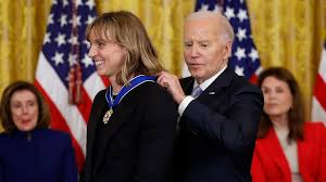 Tổng thống Joe Biden trao Huân chương Tự do của Tổng thống cho vận động viên bơi lội người Mỹ Katie Ledecky tại Phòng phía Đông của Nhà Trắng ở Washington, D.C., vào ngày 3 tháng 5 năm 2024. Tín dụng: ANDREW CABALLERO-REYNOLDS/AFP qua Getty Images
