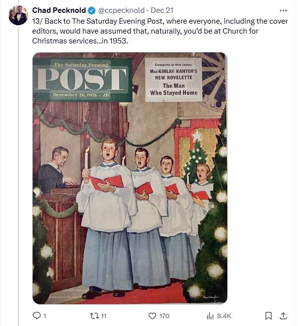 Quay lại The Saturday Evening Post, nơi mọi người, bao gồm cả biên tập viên trang bìa, đều cho rằng, tất nhiên, bạn sẽ đến Nhà thờ để dự lễ Giáng sinh… vào năm 1953.