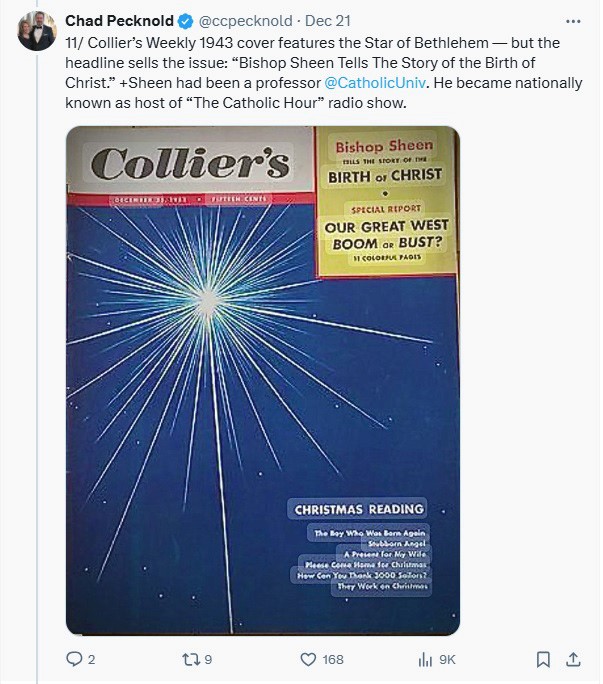 Collier’s Weekly đạt đỉnh cao vào những năm 1940 với trang bìa năm 1943 này, có hình ảnh đồ họa tối giản cho Ngôi sao Bê-lem — nhưng điểm mấu chốt là tiêu đề bán chạy của ấn phẩm: “Giám mục Sheen kể câu chuyện về sự ra đời của Chúa Kitô”. Sắp trở thành Tổng giám mục Sheen, ngài từng là giáo sư tại Đại học Công Giáo Hoa Kỳ và được biết đến trên toàn quốc với tư cách là người dẫn chương trình phát thanh The Catholic Hour với 4 triệu người nghe mỗi tuần.