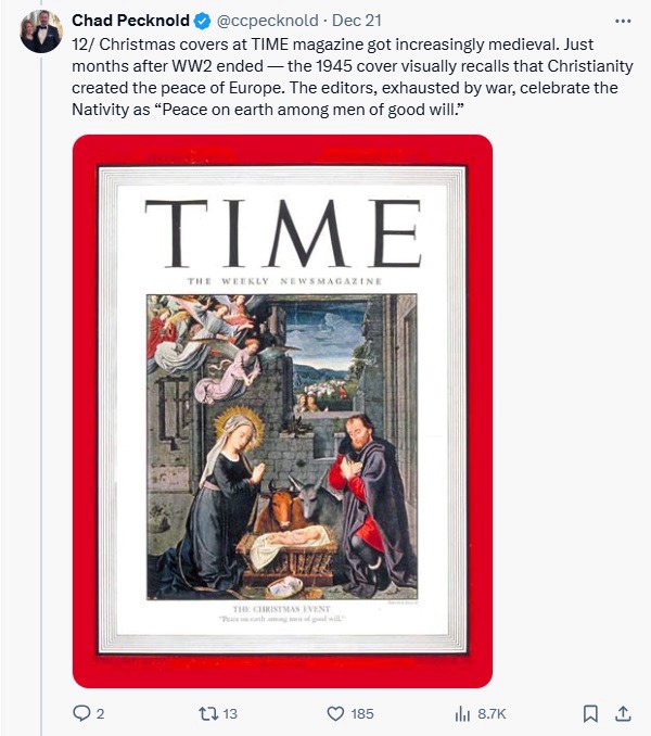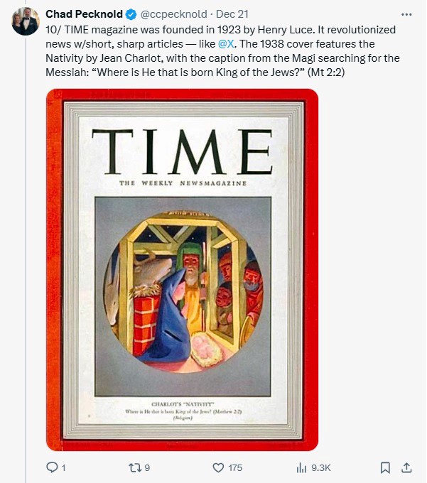 Và sau đó là tạp chí Time, được thành lập vào năm 1923 bởi Henry Luce. Tạp chí này đã cách mạng hóa tin tức bằng cách tạo ra các bài viết rất ngắn và sắc sảo — X của ngày. Chỉ chín tháng trước khi Đức xâm lược Ba Lan và chiến tranh thế giới nổ ra ở châu Âu, bìa Giáng sinh năm 1938 của Time có hình Chúa giáng sinh, của nghệ sĩ nổi tiếng người Paris Jean Charlot, với chú thích về các chiêm tinh gia (Magi) đang tìm kiếm Đấng cứu thế: “Đấng sinh ra là Vua của người Do Thái ở đâu?” (Mát-thêu 2:2)