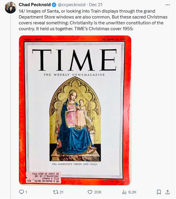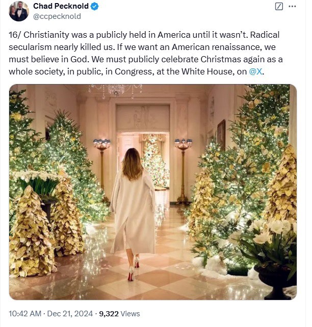 Chúng ta phải công khai ăn mừng Giáng sinh một lần nữa — không chỉ với tư cách là cá nhân, mà là cả một xã hội, ở nơi công cộng, tại Quốc hội, tại Nhà Trắng, trên X [twitter cũ].