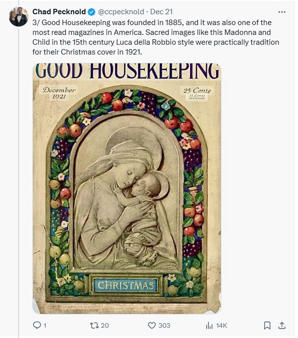 Tạp chí Good Housekeeping được thành lập vào năm 1885 và cũng là một trong những tạp chí được đọc nhiều nhất tại Mỹ. Những hình ảnh thánh thiêng như Madonna và Trẻ thơ theo phong cách Luca della Robbio thế kỷ 15 trên thực tế là truyền thống cho trang bìa Giáng sinh năm 1921 của họ.