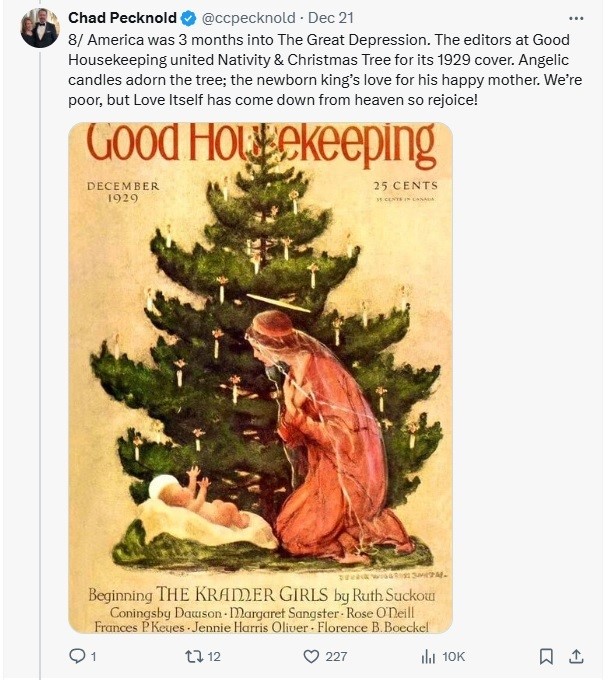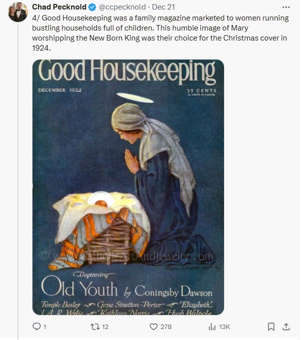 Tạp chí Good Housekeeping hướng tới những người phụ nữ điều hành những gia hộ bận rộn với nhiều trẻ em. Hình ảnh khiêm nhường này về Đức Maria đang tôn thờ Vua mới sinh là lựa chọn của họ cho trang bìa Giáng sinh năm 1924.
