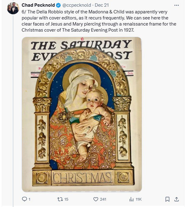 Phong cách Della Robbio của Madonna & Child từ năm 1921 rõ ràng rất được các biên tập viên bìa ưa chuộng vì nó thường xuyên xuất hiện. Chúng ta có thể thấy ở đây khuôn mặt rõ nét của Chúa Giêsu và Đức Maria xuyên qua khung thời Phục hưng cho bìa báo Giáng sinh của The Saturday Evening Post năm 1927.