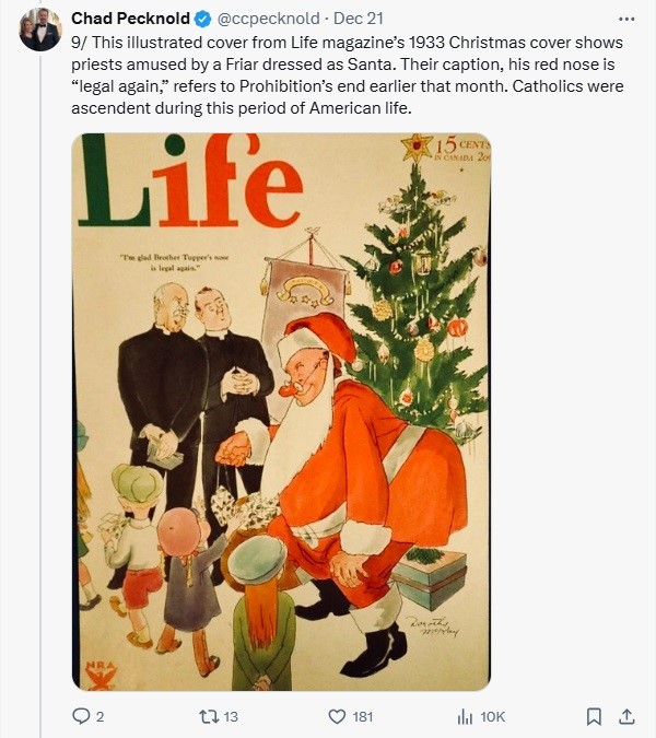 Sau đó là tạp chí Life. Bìa minh họa này từ Giáng sinh năm 1933 cho thấy hai linh mục Công Giáo bình luận về một tu sĩ mặc trang phục Thánh Ni-cô-la. Chú thích của họ, rằng chiếc mũi đỏ của ông đã “hợp pháp trở lại”, ám chỉ đến lệnh Cấm rượu vừa kết thúc với việc phê chuẩn tu chính án thứ 21: một lời nhắc nhở rằng những người Công Giáo (nổi tiếng là thích tiệc tùng và uống rượu vui vẻ) cũng chiếm ưu thế trong giai đoạn này của đời sống công cộng Hoa Kỳ.